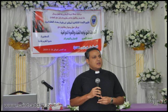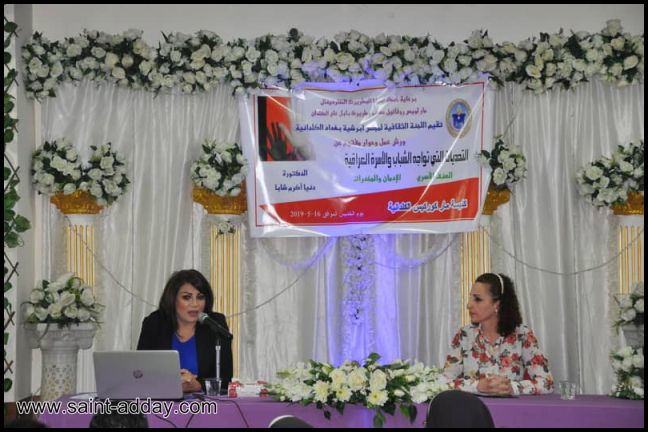 برعاية غبطة أبينا البطريرك الكاردينال مار لويس روفائيل ساكو الكلي الطوبى، نظمت اللجنة الثقافية للمجلس الراعوي لأبرشية بغداد الكلدانية، ندوة عن التحديات التي تواجه الشباب والأسرة العراقية، قامت بتقديمها الدكتورة دنيا أكرم شابا مساء يوم الخميس المصادف 16/5/2019 في كنيسة مار كوركيس الكلدانية، بحضور سيادة المطران روبرت سعيد جرجيس وعدد من الآباء الكهنة والأخوات الراهبات إضافة إلى جمع الحاضرينإبتدأ اللقاء بكلمة للأب هاني جرجس مسؤول اللجنة الثقافية، رحب فيها بالحضور وبيّن أهمية دور العائلة في المجتمع فهي الأساس لتكوين مجتمع سليمتضمنت الندوة محورين، الأول عن العنف الاسري والثاني حول الإدمان والمخدرات. حيث تحدثت الدكتورة دنيا في المحور الأول عن أنواع العنف داخل العائلة العراقية، وأهمية تفعيل دور المنظمات الإنسانية للمساهمة في حل هذه المشاكل، مع تأكيدها على أن الوعي والثقافة هما الحل الأمثل لمثل هذه المشاكلأستؤنِف اللقاء بعد فترة استراحة قصيرة، حيث بينت الدكتورة دنيا في المحور الثاني للندوة مدى خطورة انتشار المخدرات في العراق رغم قلة نسبتها مقارنة بدول أخرى، وذكرت أهم الأسباب التي قد تؤدي إلى تعاطي المخدرات، ومنها الضغوطات النفسية، الفراغ، الوحدة، ضعف الإرادة، وغيرها. ثم أكدت على ضرورة التوجيه والإرشاد لتوعية الشباب للوقاية من خطر المخدرات، وأضافت أن علاج حالات الإدمان يتطلب توفير مراكز صحية مؤهلة، وعمل دورات تثقيفية، مع المتابعة المستمرة للأشخاص المتعاطين للمخدراتتخلل اللقاء كذلك تقديم أفلام قصيرة عن محوري الندوة، إضافة إلى مجموعة من المداخلات والأسئلة التي تم توجيهها من قبل الحضور، وأجابت عليها الدكتورة دنيا مبيّنة أن مبدأ العقاب وحده لن يحل المشكلة، إنما يجب أولاً إتخاذ مبدأ النقاش والتوجيه كَحلّ أمثلثم اختُتِم اللقاء بكلمة لسيادة المطران روبرت توجه فيها بالشكر الجزيل لكافة المشاركين في تنظيم هذا اللقاء، وتم تقديم درع يحمل شعار اللجنة الثقافية، للدكتورة دنيا، والذي قام بتصميمه الشماس بسام صبريالدكتورة دنيا أكرم حاصلة على شهادتي الماجستير والدكتوراه من الولايات المتحدة في إدارة وقيادة التعليم العالي والبحث العلمي، وكذلك حاصلة على شهادة الماجستير في السياسة باختصاص النزاعات الدولية، وهي ناشطة في مجال الوقاية من المخدرات حيث قدمت العديد من الدورات في هذا المجال وفي عدة محافل منها مؤتمر نقابة المحامين في العراق ووزارة الدفاع ووزارة الداخلية وسواها من منظمات المجتمع المدني